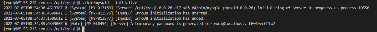 ./bin/mysqld --initialize # 生成初始密码,见下图终端(记住,后面登录MySQL需要)