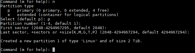 sudo fdisk /dev/sdc,图中红字因为磁盘太大有4T,因此需要先进行3,再添加分区当在linux中使用fdisk对大于2T的硬盘进行分区的时候,只能使用其中的2T,剩余的就无法分区挂载,可使用parted命令进行对2T以上硬盘进行分区: 参考4